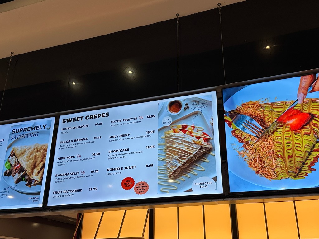I love Romeo and Juliet! And I want to be Juliet in a future Project Shakespeare play. Anyway, today we went to an underground mall! It was sooooo cool. At one point we got something to eat, and we found a crepe shop. This was the menu. I kind of had no choice…