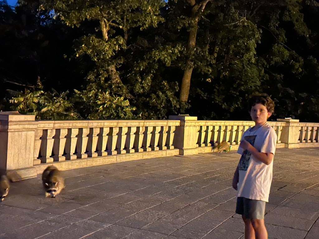 Last night we went up to a Mount Royal to see the city at night. We also saw some raton laveur. That is French. It means ā€˜washing rat’ A.K.A. Raccoon. We saw 4 of them. This was our view.